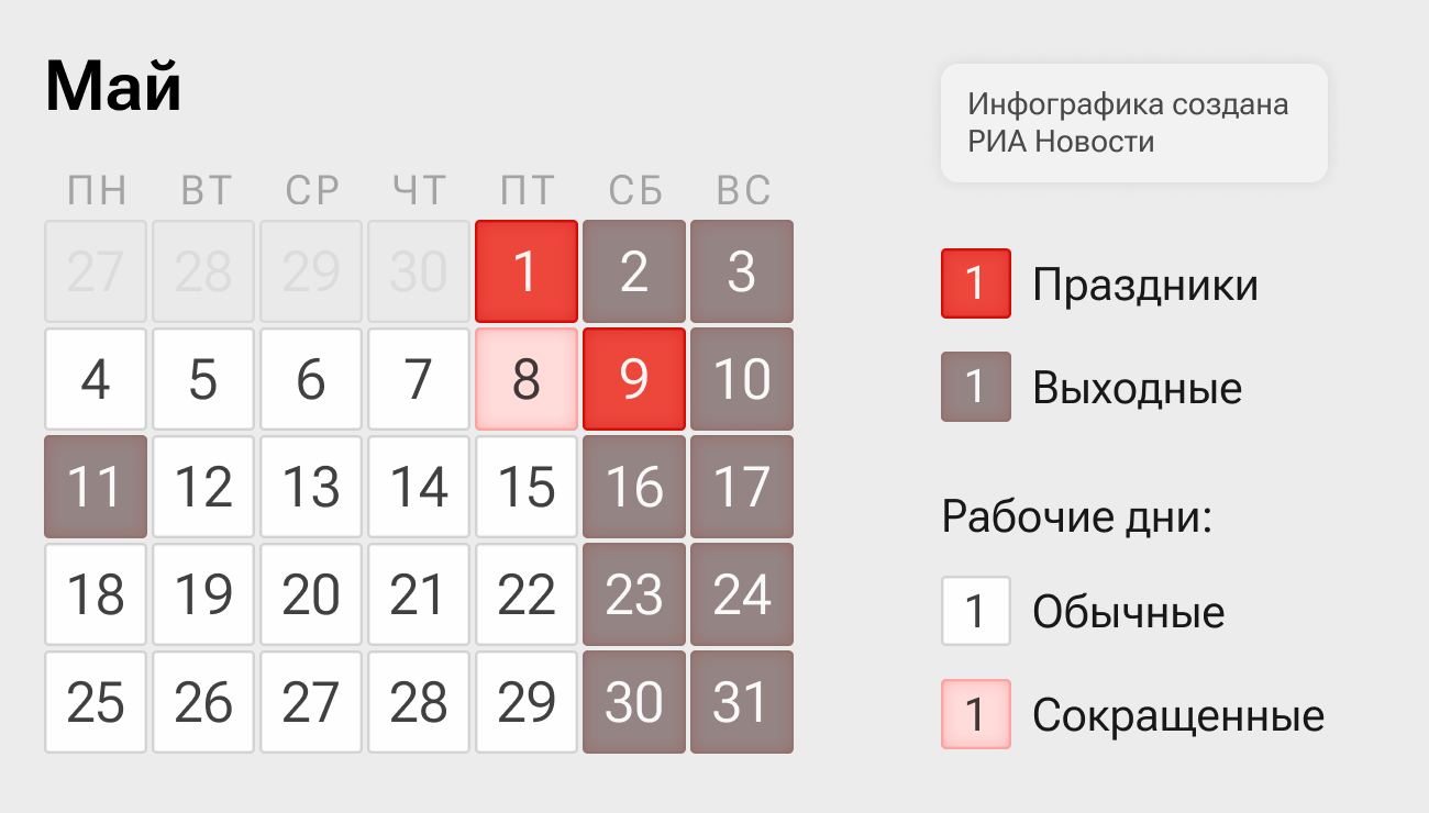 Однако с финансовой стороны май — не самый выгодный месяц. Из-за малого количества рабочих дней стоимость одного рабочего дня выше, чем в апреле или июне, а отпускные рассчитываются по среднему заработку.