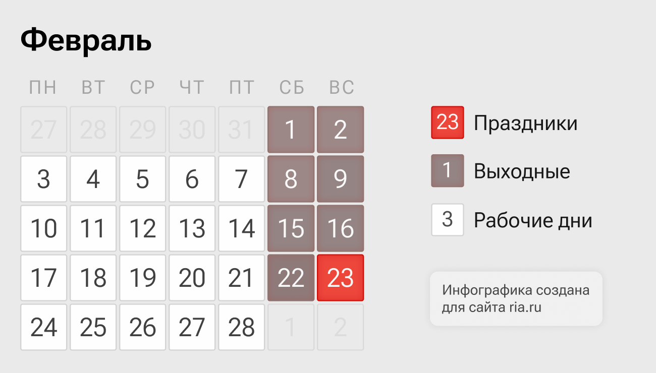 Во втором месяце года в России отмечают один государственный праздник – День защитника Отечества – 23 февраля. Так как в 2025 году он выпадает на воскресенье, дополнительного выходного дня в феврале не будет, он перенесен на майские праздники Всего в этом месяце 20 рабочих дат и 8 выходных.Официальные выходные дни в России