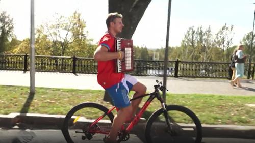 Климентий Калужских разъезжает по России на велосипеде на ходу играя на баяне и руля при этом «без рук».
